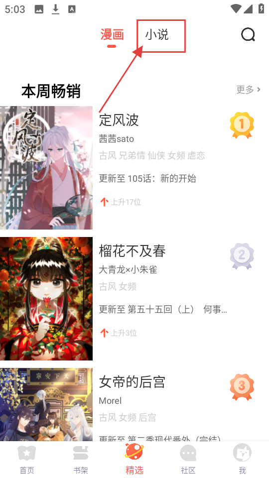 2、进入精选页面后,我们可以点击【小说】,切换到小说分类,查看本周畅销等小说内容。