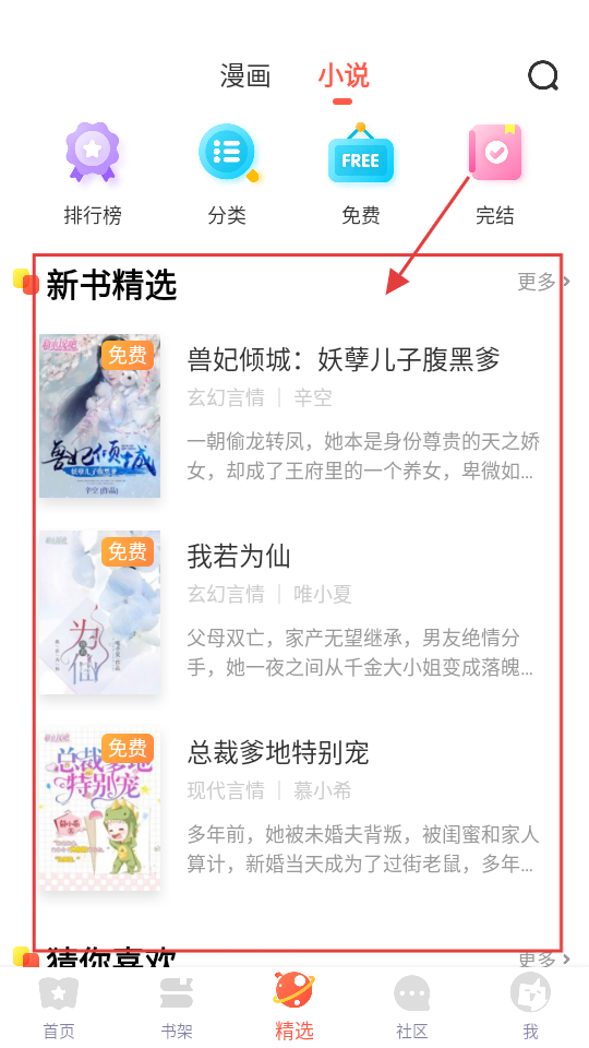 3、在小说分类下,有新书精选板块,里面有《兽妃倾城:妖孽儿子腹黑爹》等小说,我们点击感兴趣的小说。