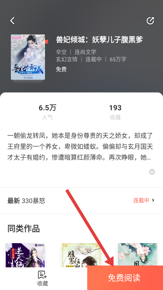 4、进入小说详情页面后,我们可以看到小说的人气、收藏等信息,点击【免费阅读】,就能开始免费阅读小说啦。
