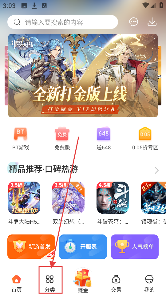 1、首页点【分类】,进入游戏分类页面,可筛选游戏类型哦。