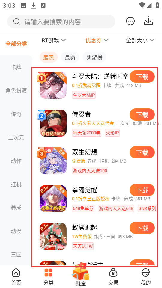 2、点击分类,你可以根据游戏类型,或者搜索功能找到自己想玩的游戏;
