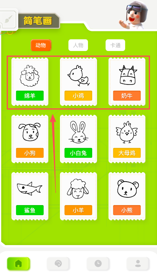 1、先从首页进入“简笔画”板块,你可以看到动物、人物和卡通等分类,比如有小鸡、绵羊、小狗这些可爱图案。