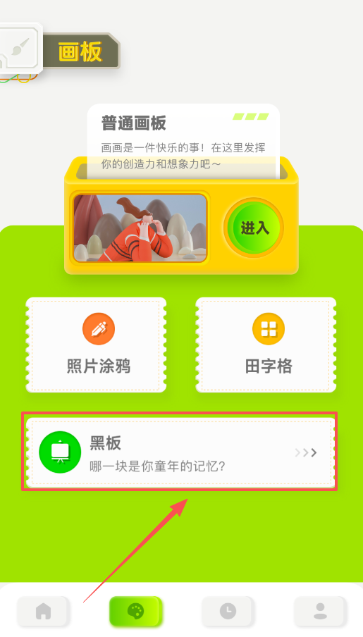 3、在画板区域往下滑动,你会看到“田字格”和“黑板”两种特殊画布,点击“田字格”可以用来练习写字或画对称图案。