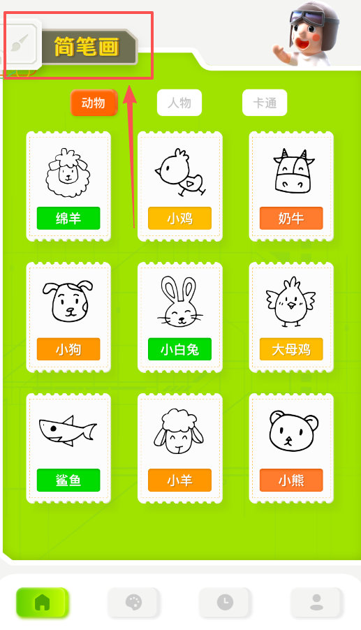 1、打开应用后,可以点击底部的“简笔画”分类,里面有动物、人物和卡通等选项,适合初学者快速找到绘画灵感。