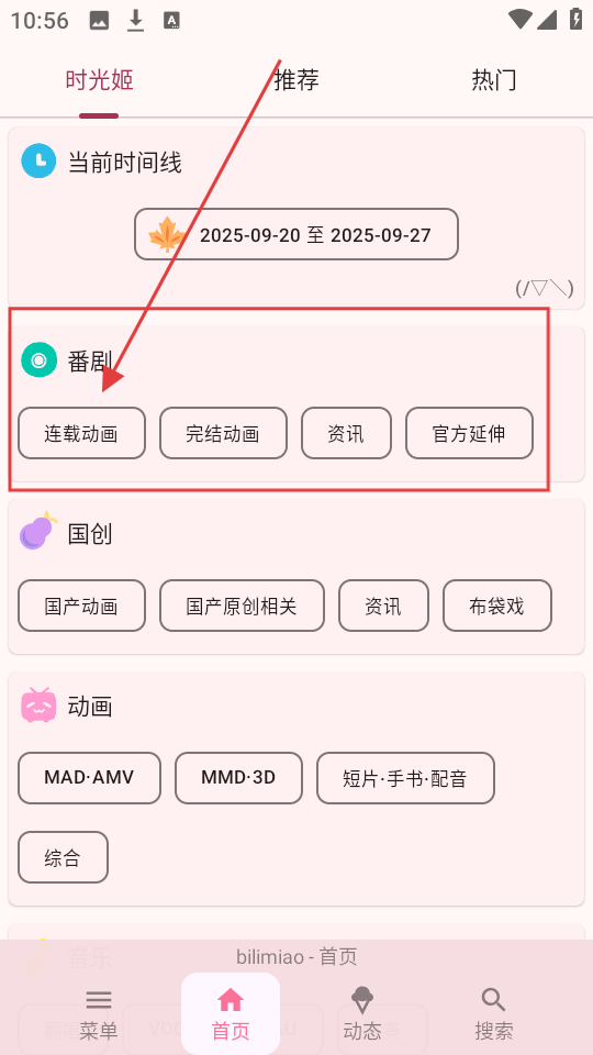 1、在软件首页,能看到“番剧”分类下有【连载动画】【完结动画】等这些选项,点击对应选项就能浏览相关番剧内容啦。