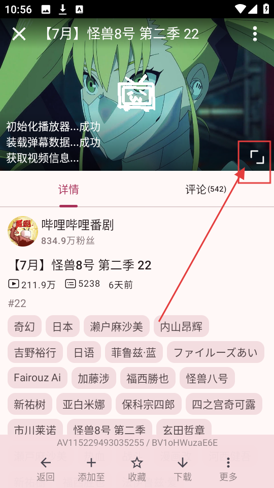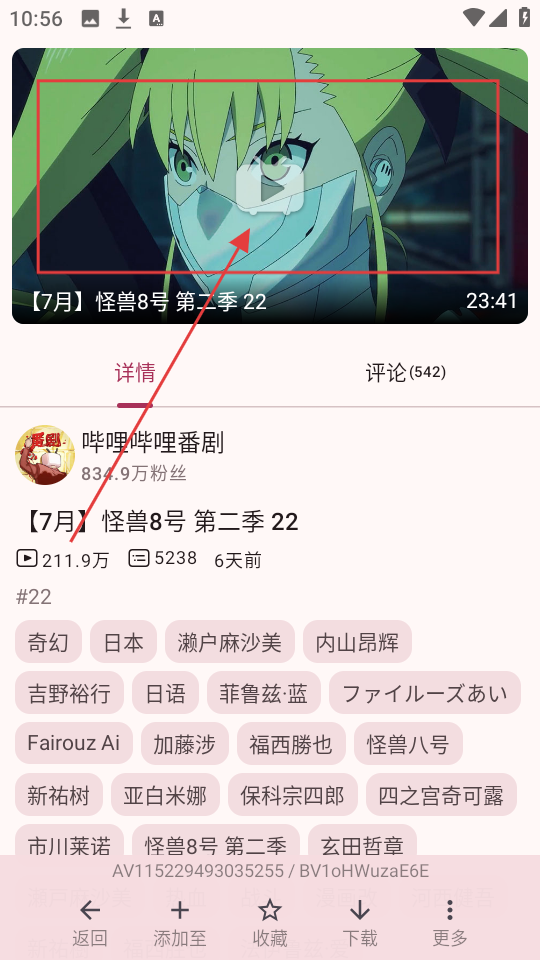 3、选择好想看的动画,比如【怪兽8号第二季22】,点击进入详情页,能看到动画封面、播放量等信息,点击封面就能开始播放动画啦。