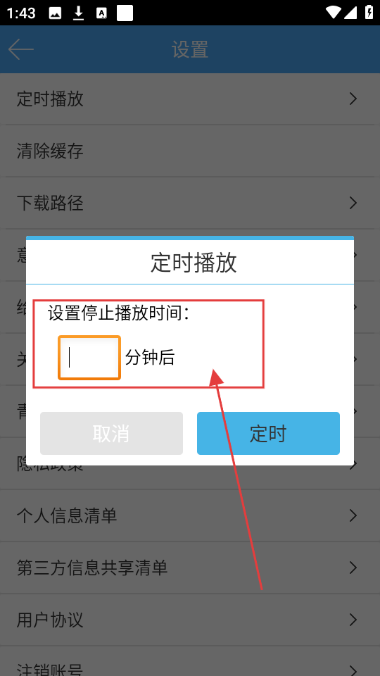 3、在定时播放设置页面,输入想要的停止播放时间,比如30分钟后,设置定时时间呢。