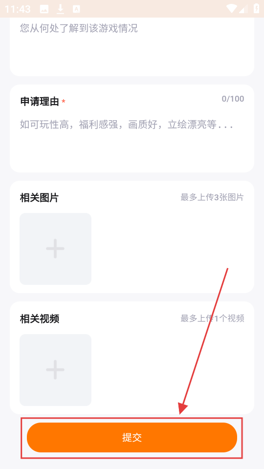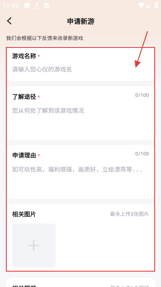 3、在申请新游页面,填写游戏名称、了解途径、申请理由等信息,还可上传相关图片哦。