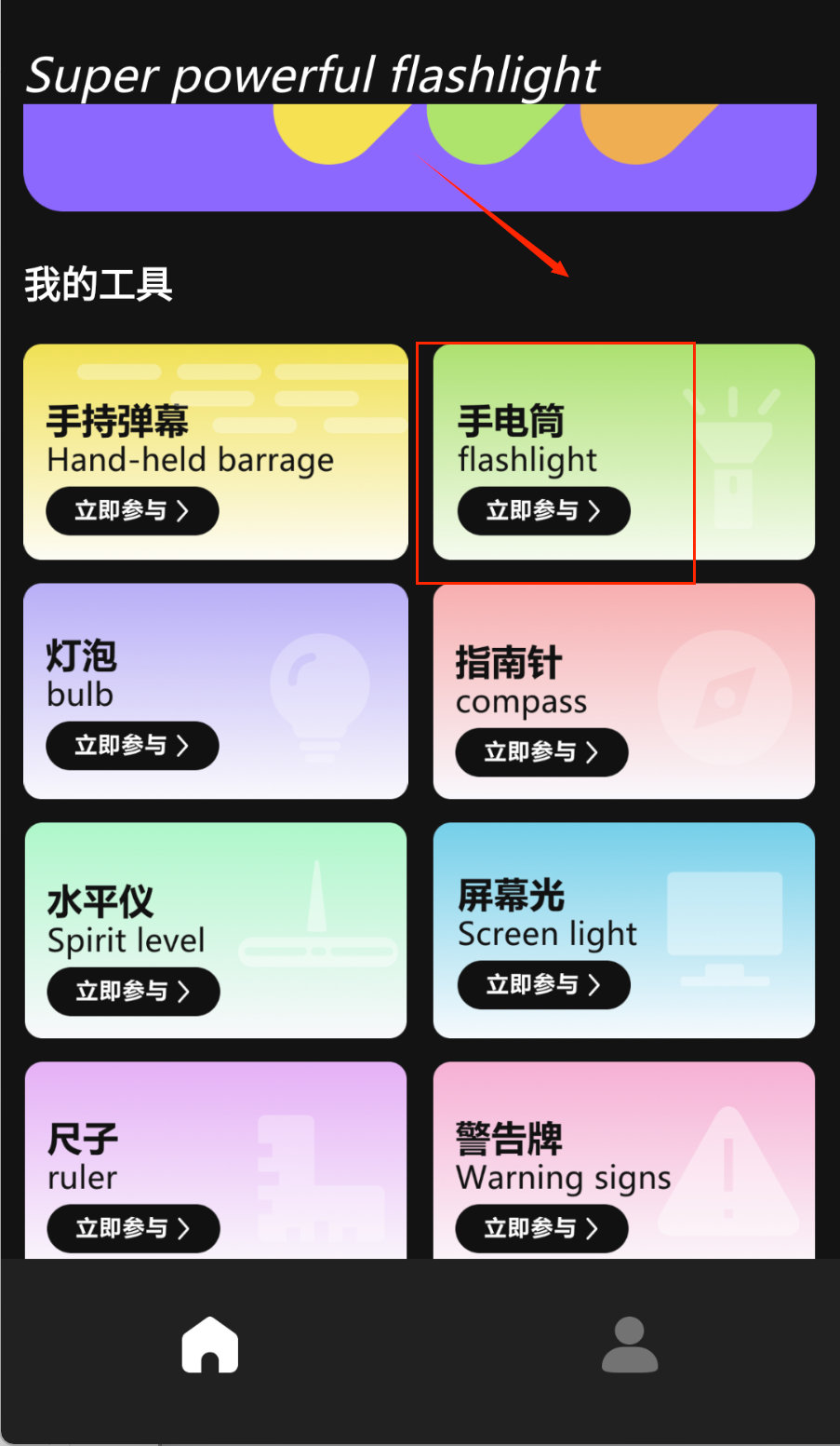3、使用炫彩手电筒等工具也很简单,回到软件主页,找到“我的工具”区域。这里有手电筒、指南针、水平仪等多种选项。