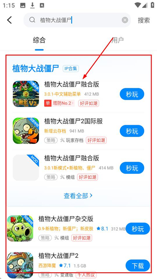 3、搜索结果里选心仪的游戏,比如【植物大战僵尸融合版】,点进去看详情呢。