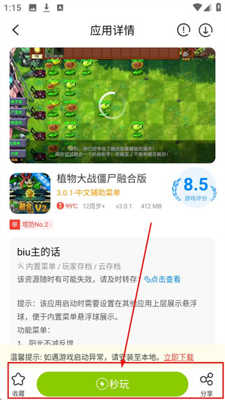 4、游戏详情页点【秒玩】,就能直接开始玩游戏,是不是很方便呀。
