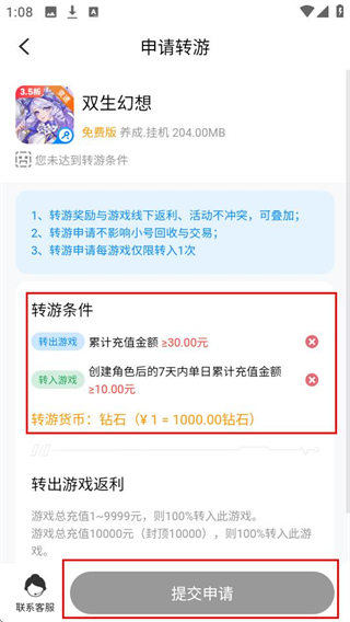 4、在申请转游页面确认转游条件后,点击【提交申请】,就能申请转游啦。
