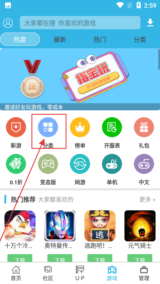 1、在游戏页面找到【分类】按钮,点击进入就能看到各种游戏分类选项,方便找到心仪游戏啦。