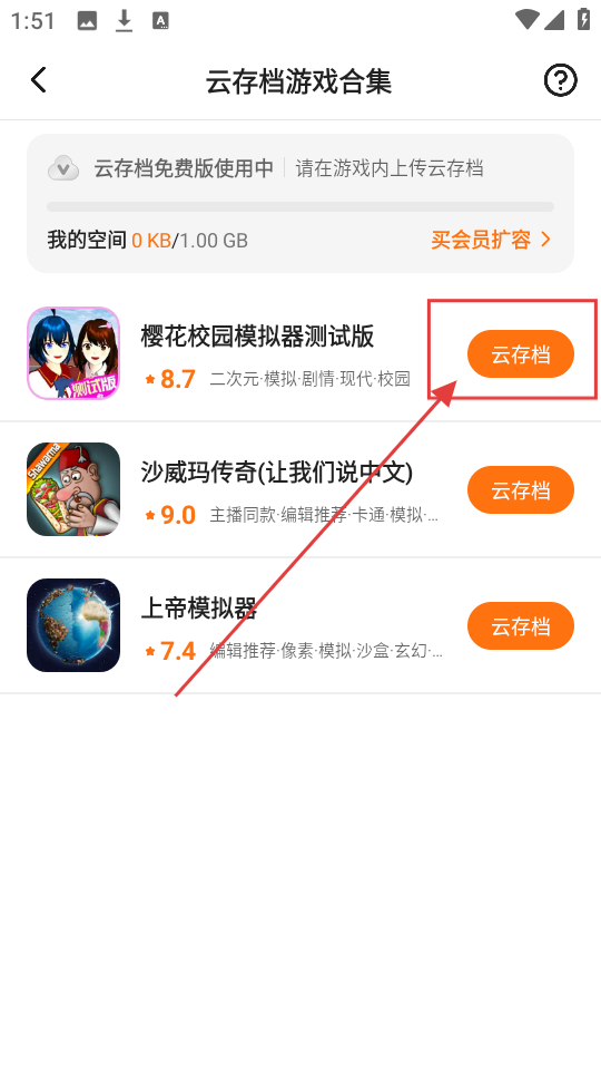 3、在云存档游戏合集页面,若想对某款游戏进行云存档操作,点击对应游戏旁的【云存档】按钮就行啦。
