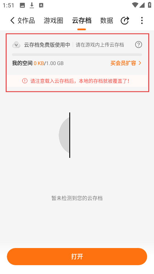 4、进入游戏云存档页面,能看到云存档使用提示,要注意载入云存档会覆盖本地存档,根据需求操作哦。