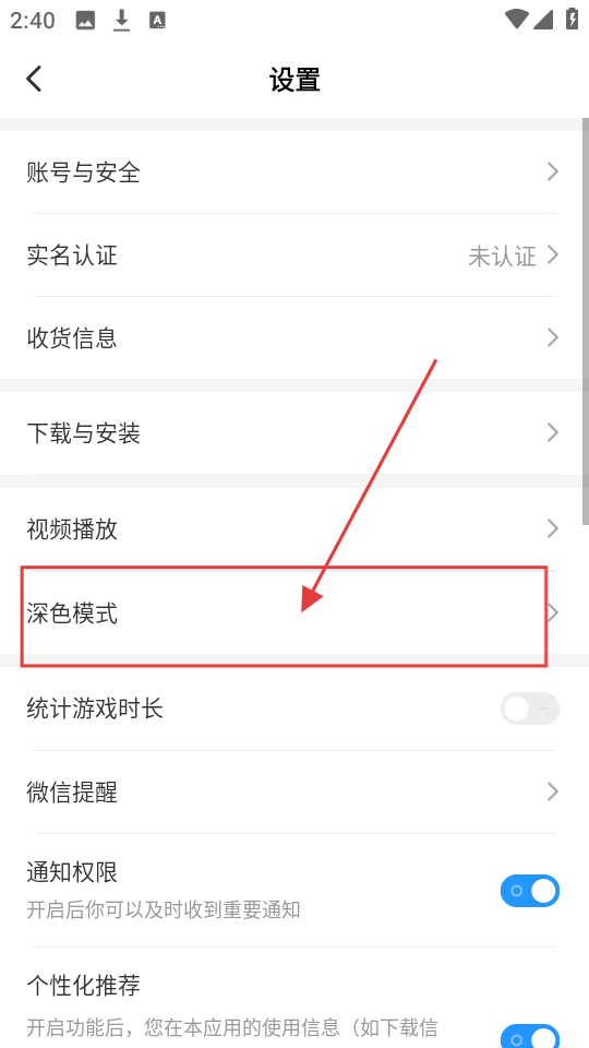 3、进入设置页面后,找到【深色模式】选项并点击,可进入深色模式的设置界面,准备开启深色模式哦。