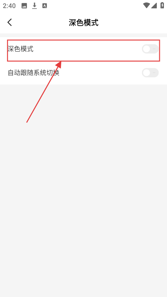 4、在深色模式设置界面,点击【深色模式】对应的开关,便能成功开启深色模式,让界面变为深色啦。