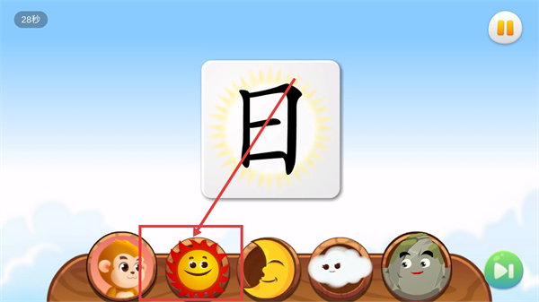 4、在汉字选择页选正确的汉字,比如对应太阳形象的【日】字,点它就能完成这轮识字任务啦。