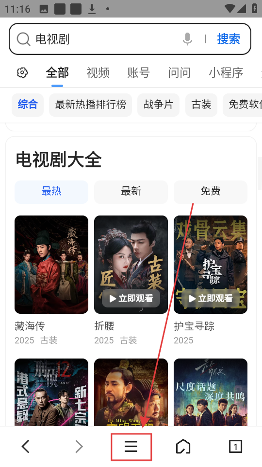1、我们在搜索“电视剧”的页面,点击底部的三横线图标,就能展开功能菜单,查看收藏、历史记录等选项啦。
