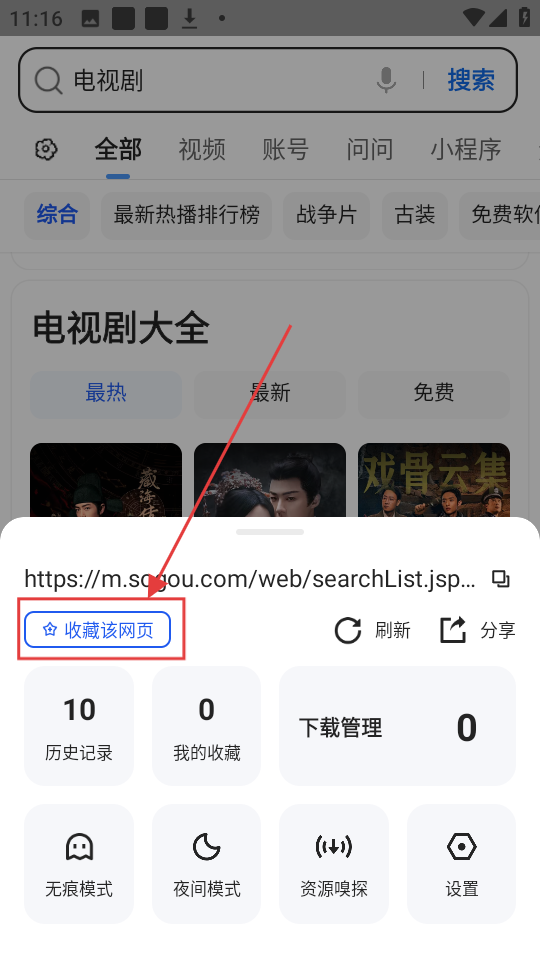 2、展开功能菜单后,我们点击【收藏该网页】,就能将当前电视剧相关网页添加到收藏中。