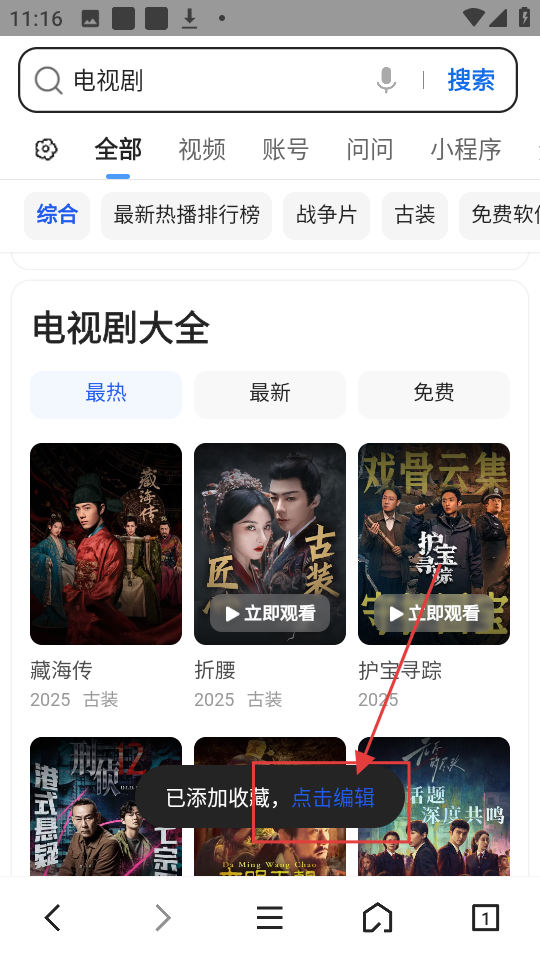 3、添加收藏后,页面会提示“已添加收藏,点击编辑”,我们点击【点击编辑】,就能进入编辑书签页面。