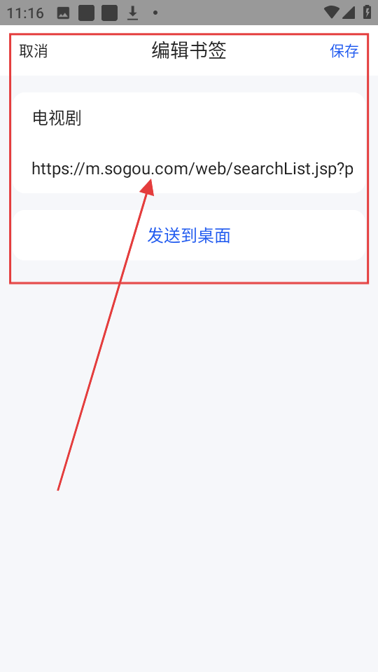 4、进入编辑书签页面后,我们可以看到书签名称和网址等信息,还能点击【发送到桌面】,把书签发送到桌面哦。