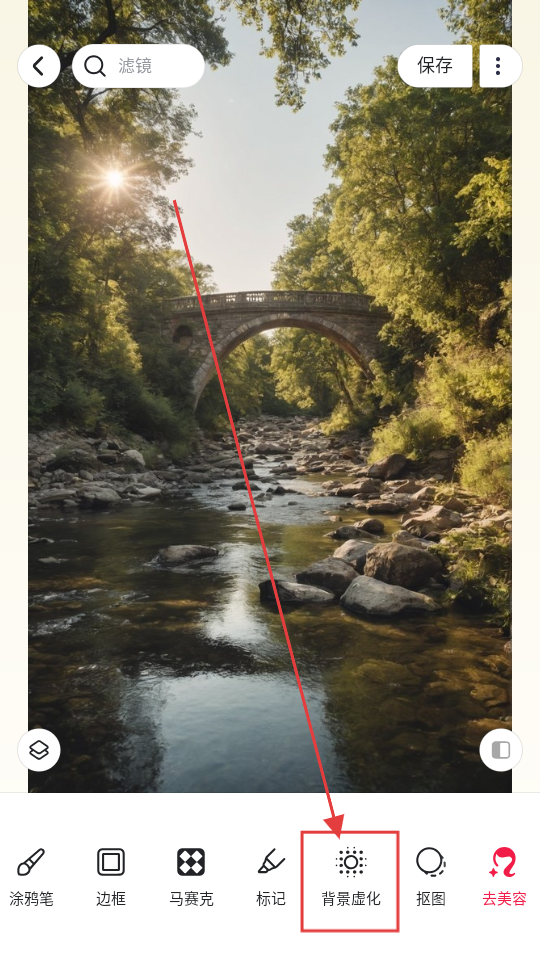 1、在图片编辑页面,点击【背景虚化】,可进入背景虚化设置页面,准备调整背景虚化效果啦。