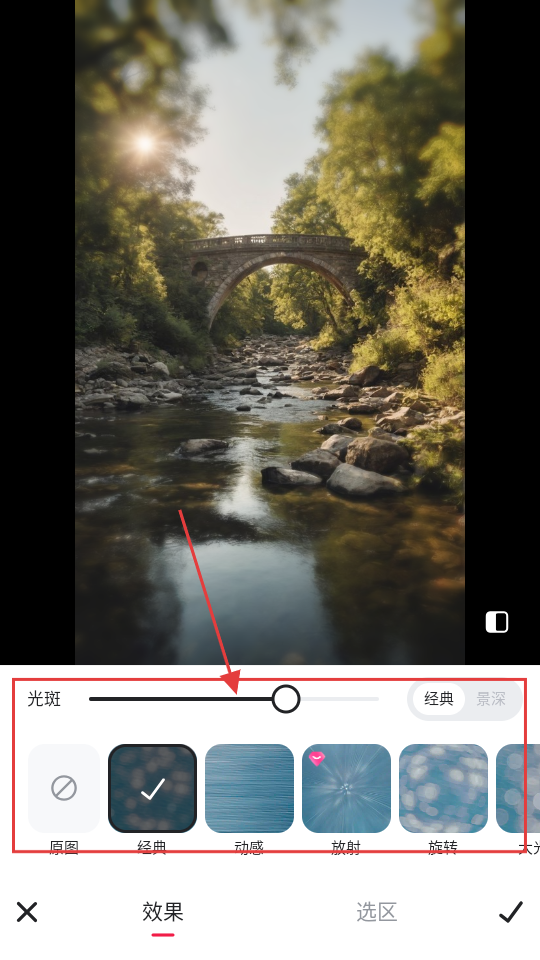 2、进入背景虚化设置页面后,可选择光斑效果,如经典、动感等,还可调整光斑强度哦。