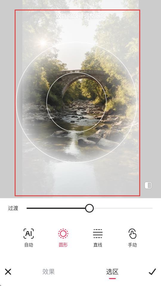 4、选择圆形选区后,可调整选区范围,双指缩放即可调整,调整好后可完成背景虚化设置哦。