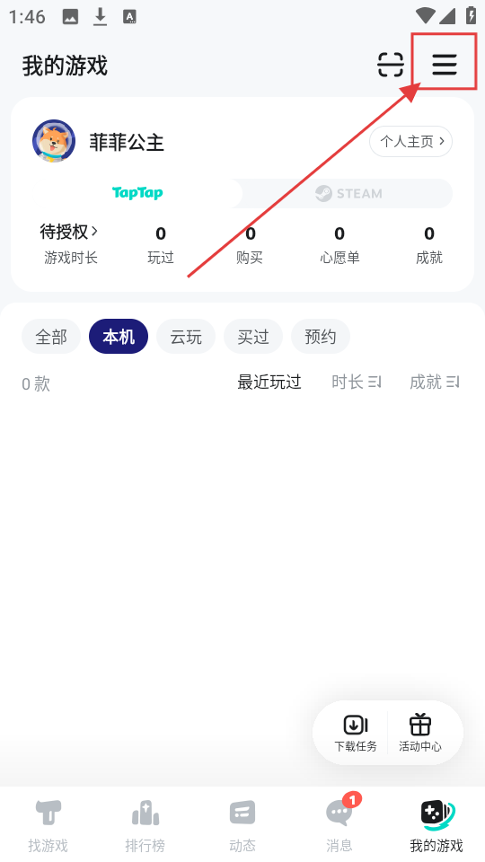 2、进入“我的游戏”页面,点击右上角菜单图标,就能展开侧边栏,看到各类功能选项咯。