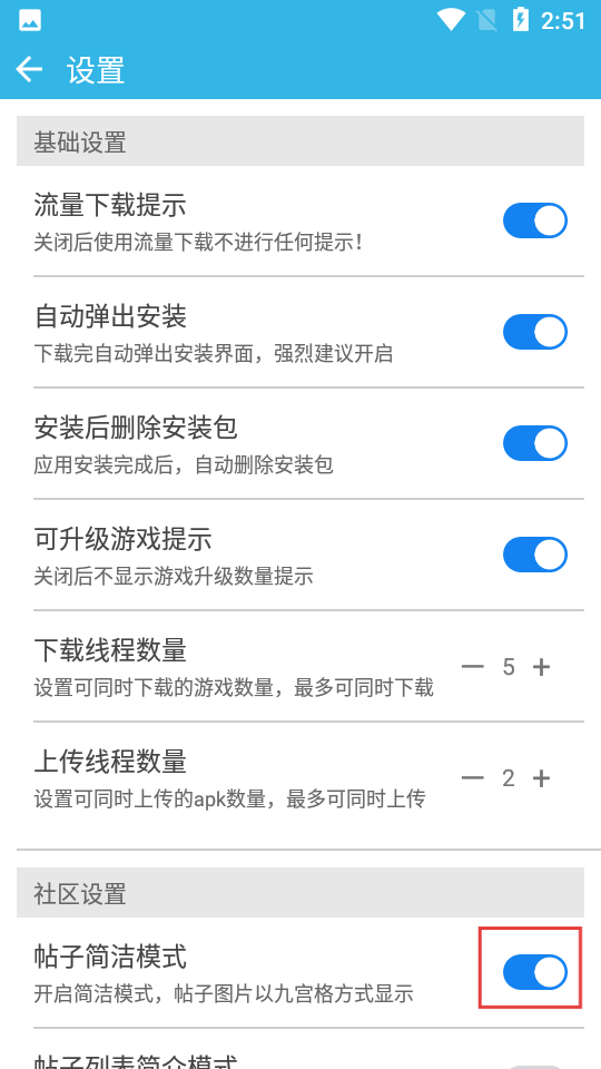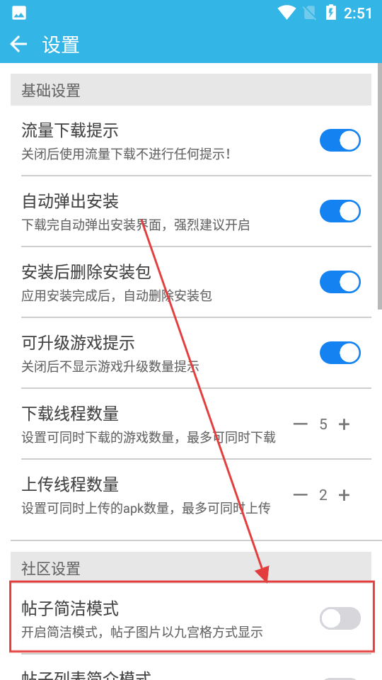 3、在设置页面,找到【帖子简洁模式】选项,可看到该模式的开关啦。