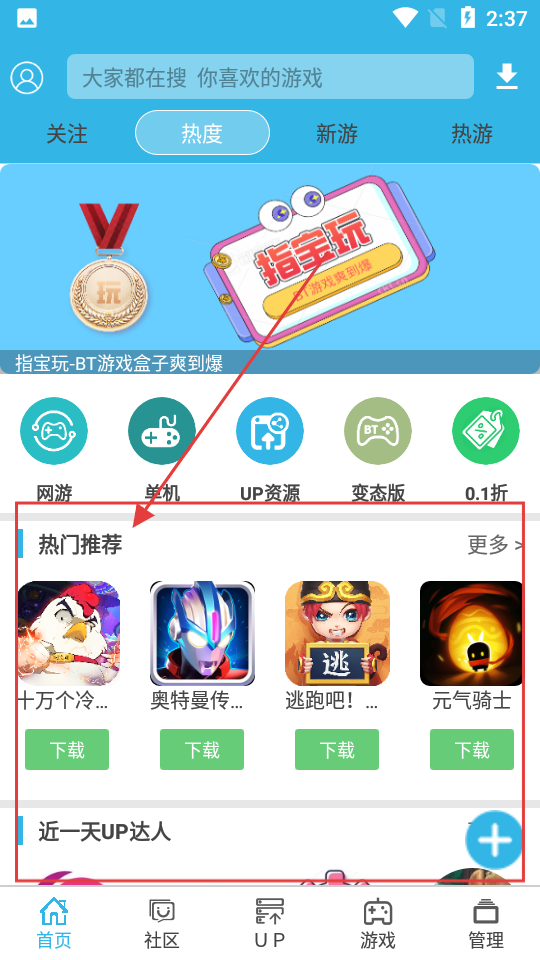 1、在首页【热门推荐】板块找到感兴趣的游戏,比如【奥特曼传...】,点击就能进入游戏详情页啦。