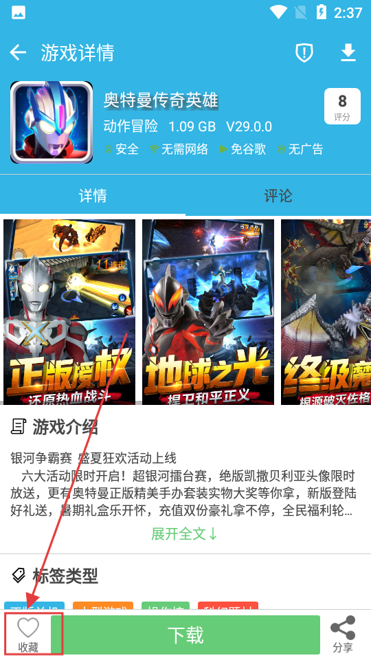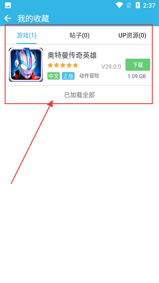 4、在【我的收藏】页面,能看到收藏的游戏列表,比如【奥特曼传奇英雄】,想下载就点击绿色下载按钮哦。