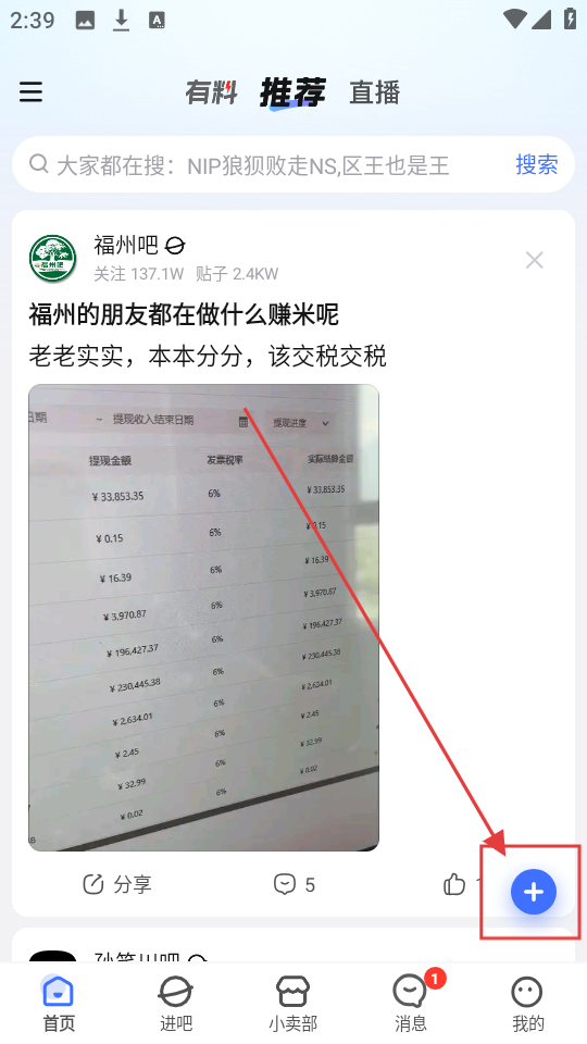 1、我们在软件首页,能看到推荐的帖子等内容,点击右下角的加号图标,就能进入发帖子的编辑页面啦。