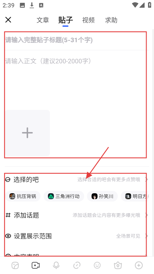 2、进入发帖子编辑页面后,我们可以输入帖子标题、正文,还能选择要发布的“吧”、添加话题等。
