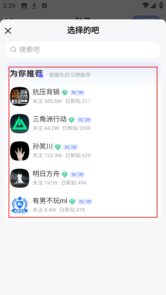 3、点击“选择的吧”,会进入推荐“吧”的页面,这里有根据习惯推荐的热门“吧”,我们可以选择合适的“吧”。
