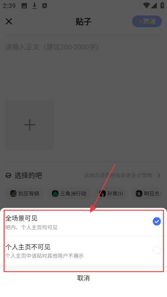 4、在设置展示范围时,我们可以选择“全场景可见”或“个人主页不可见”,根据需求设置后,就可以发布帖子啦。