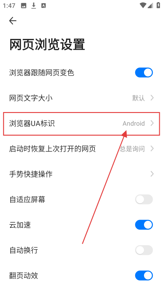 3、在网页浏览设置页面,点击【浏览器UA标识】选项,进入标识选择页面呢。