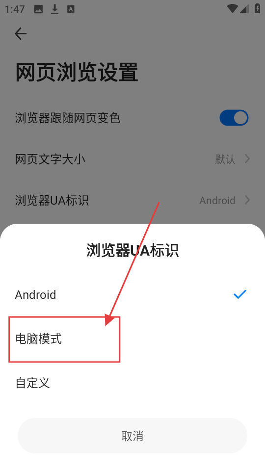 4、在标识选择页面,选择【电脑模式】,即可切换浏览器UA标识,优化网页浏览体验啦。