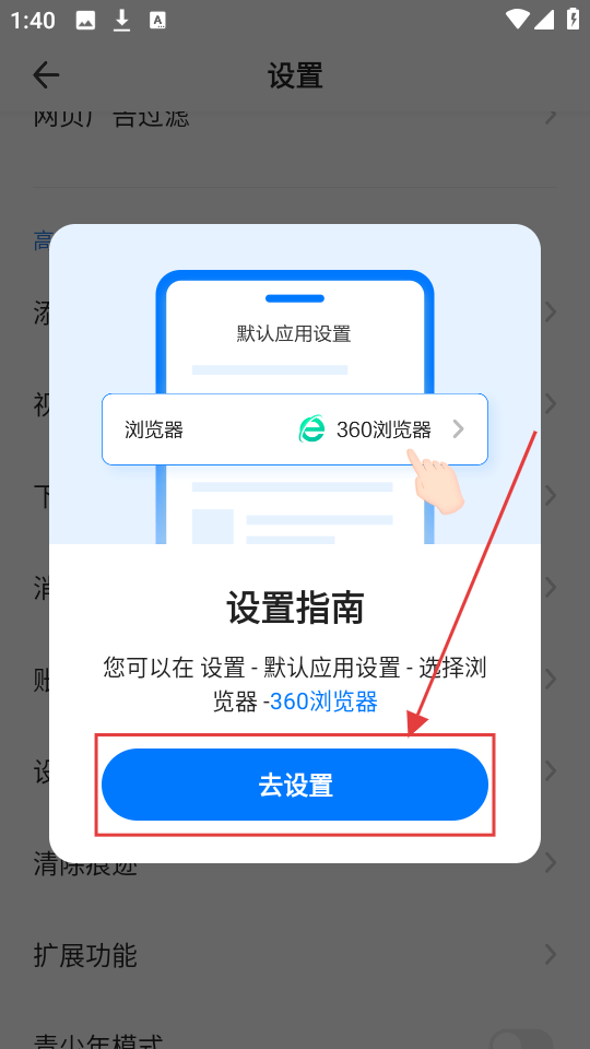 4、进入默认浏览器设置流程后,点击【去设置】按钮,即可按照指南完成默认浏览器设置啦。