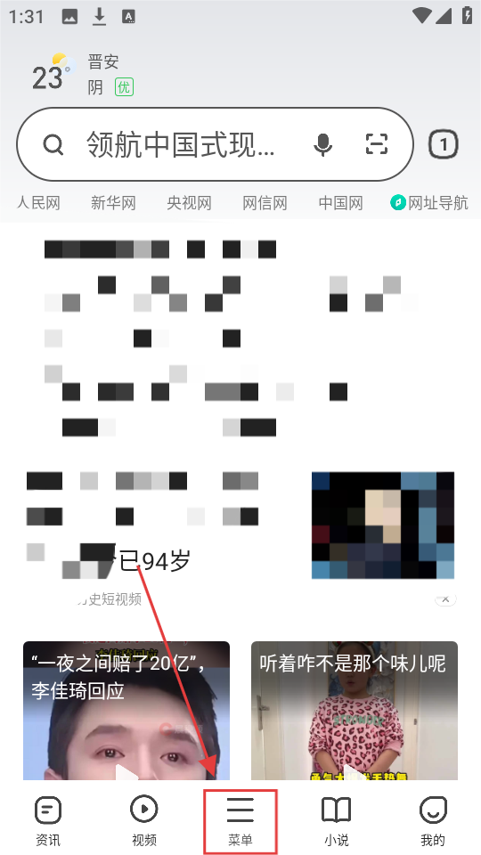 1、打开APP,点击底部【菜单】选项,弹出功能菜单,准备清理浏览痕迹啦。