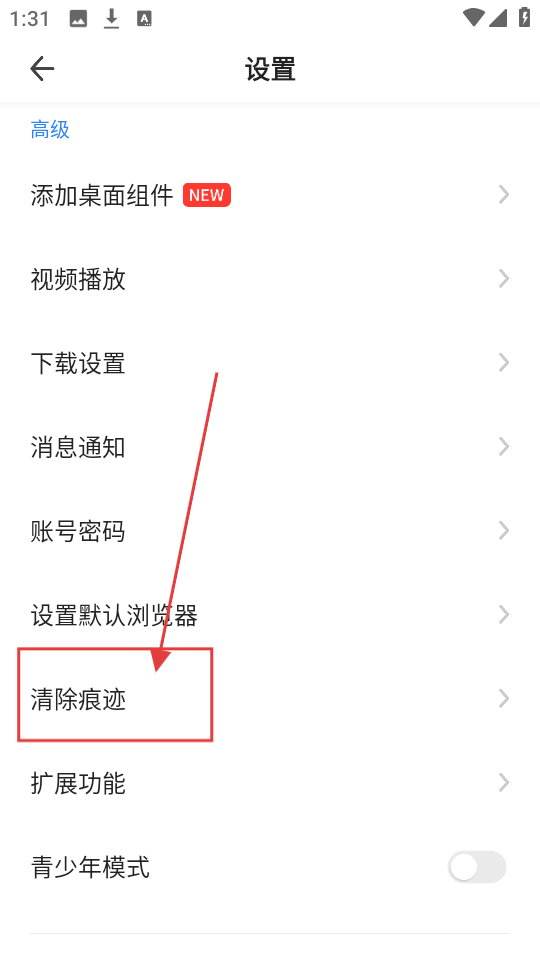 3、在设置页面,找到【清除痕迹】选项并点击,进入清除痕迹设置页面呢。