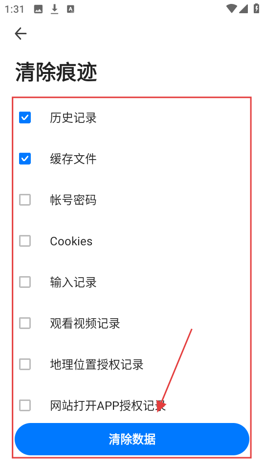 4、在清除痕迹设置页面,选择要清除的内容后,点击【清除数据】按钮,即可完成浏览痕迹清理啦。