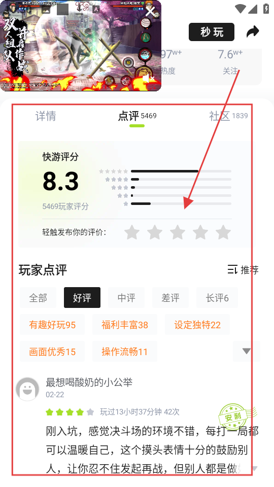 3、在点评页面,能看到快游评分和玩家的好评、中评等分类点评,了解游戏口碑超方便哦。
