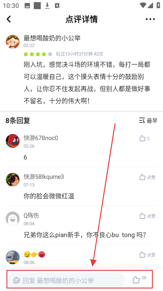 4、在点评详情页,点击【回复最想喝酸奶的小公举】,就能和玩家互动,发表自己的看法啦。