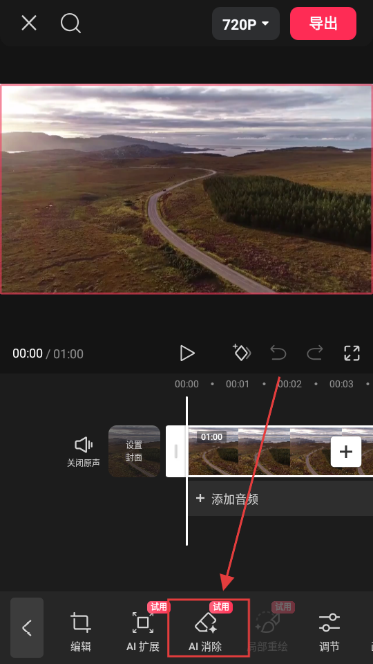 2、在视频编辑界面,找到【AI消除】功能选项,点击它,进入AI消除设置界面,准备进行消除操作哦。