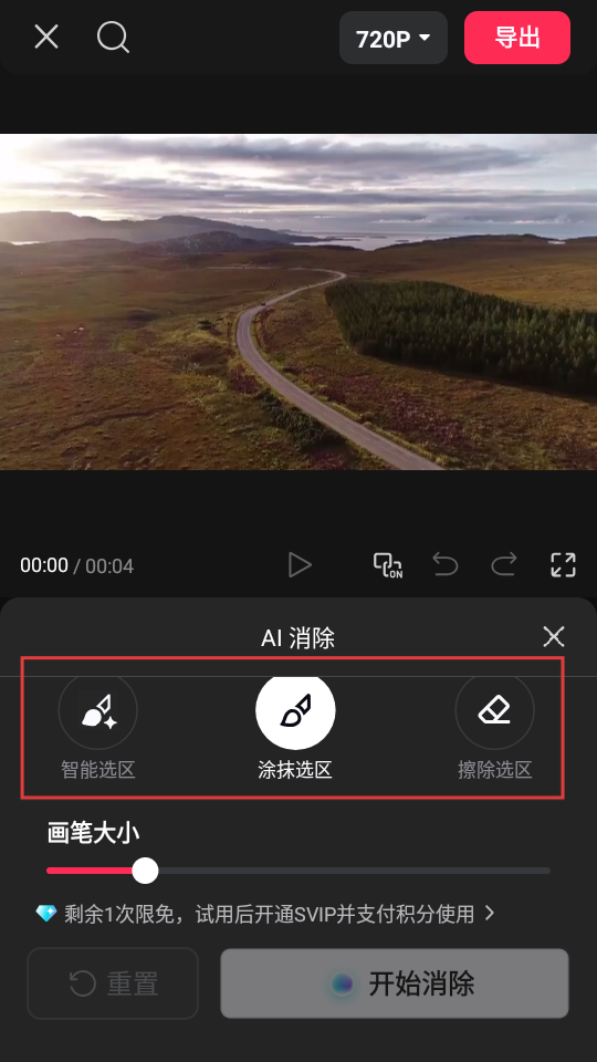 3、在AI消除设置界面,选择合适的选区方式,比如【涂抹选区】,并调整画笔大小,方便精准选择消除区域啦。