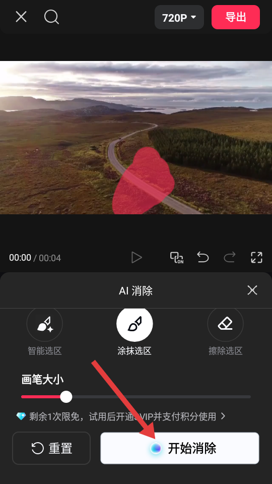 4、选好消除区域后,点击【开始消除】,剪映就会利用AI技术对所选区域进行消除,完成后可查看效果啦。