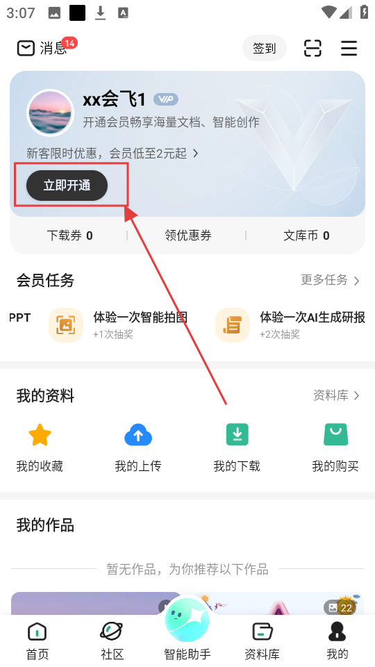 2、在个人中心页面,点击【立即开通】按钮,进入开通VIP页面,可选择会员时长哦。