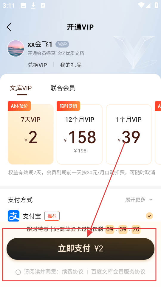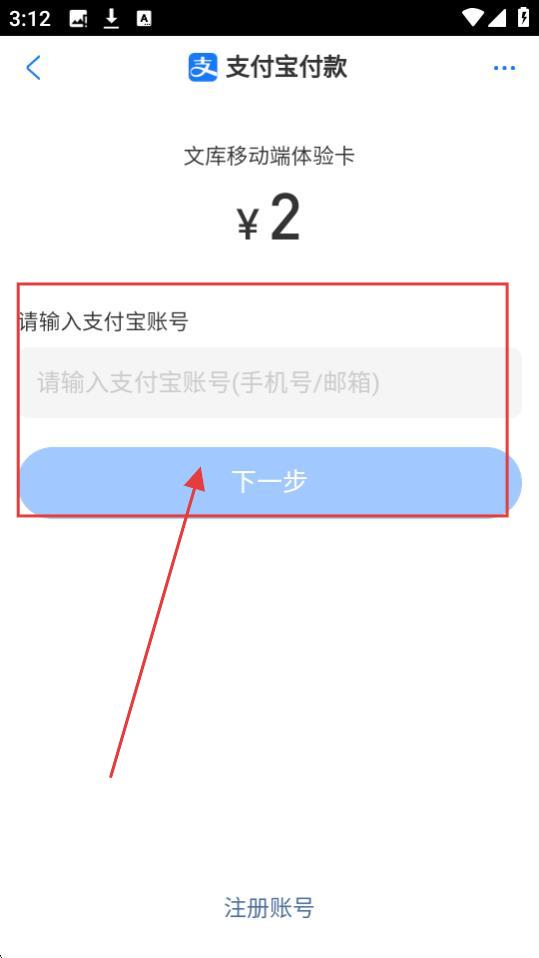 4、在支付页面,输入支付宝账号,点击【下一步】,按流程完成支付,即可开通文库VIP啦。